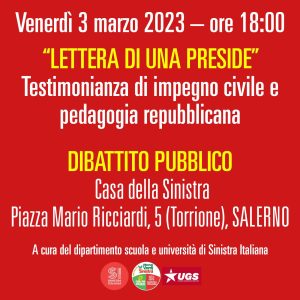 L’appuntamento è per domani, venerdi’ 3 Marzo, all’interno della sede della Casa della Sinistra di Salerno, a Torrione, a partire dalle 18:00: al centro di un dibattito, di natura chiaramente politica, la vicenda della lettera della Preside di Firenze, originaria della Provincia di Salerno, dopo gli scontri avvenuti dinanzi ad una scuola del centro toscano, tra giovani di sinistra e di estrema destra. All’evento, organizzato dal Dipartimento Università di Sinistra Italiana di Salerno, parteciperà anche il deputato di AVS Fracno Mari.