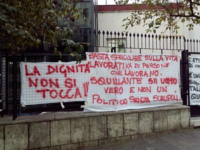 Alcuni lavoratori sono saliti sul cornicione della struttura minacciando di buttarsi giù. Temono che la riduzione delle ore di lavoro e quindi dello stipendio, provvedimento che potrebbe scattare dal primo febbraio. Sul posto sono intervenuti i vigili del fuoco e le forze dell’ordine.