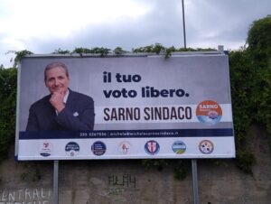 Sono 8 i simboli che compaiono sui manifesti che, da qualche ora, sono stati affissi nei punti strategici della città di Salerno dal Comitato Promotore della campagna elettorale di Michele Sarno, l’avvocato penalista candidato alla carica di sindaco del Comune capoluogo. Un primo gruppo di liste e di movimenti civici in attesa della decisione da parte di Lega, Forza Italia ed Udc, che, al termine dell’ultima riunione regionale del centro destra, avevano espresso il proprio sostegno sul nome di Michele Sarno. Pare per la chiusura definitiva dell’intesa sia necessario ancora qualche giorno, intanto Michele Sarno ha deciso di presentare alla città di Salerno la sua coalizione attuale, in attesa della decisione finale di alcuni dei partiti del centro destra.