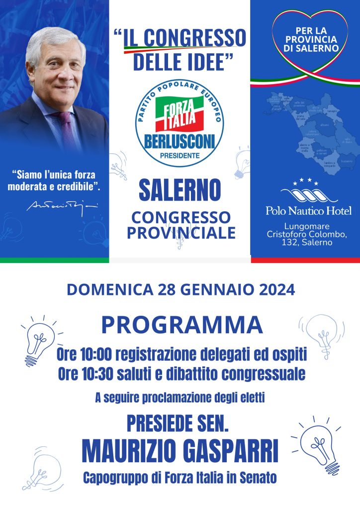 Per la prima volta nella storia – fatta eccezione per la parentesi del Pdl – i Forzisti della Provincia di Salerno si apprestano ad affrontare il congresso provinciale per l’elezione del Coordinatore. Un confronto che, considerata la mozione unica che porta al nome di Roberto Celano, è stato molto piu’ vivace prima del congresso, in programma domani mattina al Polo Nautico di Salerno, a partire dalle 10:00, che all’interno dell’assemblea elettiva che sarà una semplice consacrazione del nome unitario attorno al quale il partito si è ritrovato. Al congresso, presieduto dal parlamentare azzurro Maurizio Gasparri, prenderanno parte anche gli europarlamentari Lucia Vuolo e Fulvio Martusciello, insieme ai parlamentari Franco Silvestro e Tullio Ferrante.