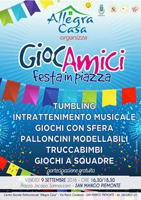 Si terrà venerdì 9 settembre dalla ore 16,30 alle ore 18,30 la festa in piazza “GiocAmici” organizzata dal Centro Sociale Polifunzionale Allegra Casa in collaborazione con il Centro Polifunzionale “Padre Lorenzo Natiello” in località San Mango Piemonte, Piazza Jacopo Sannazzaro.