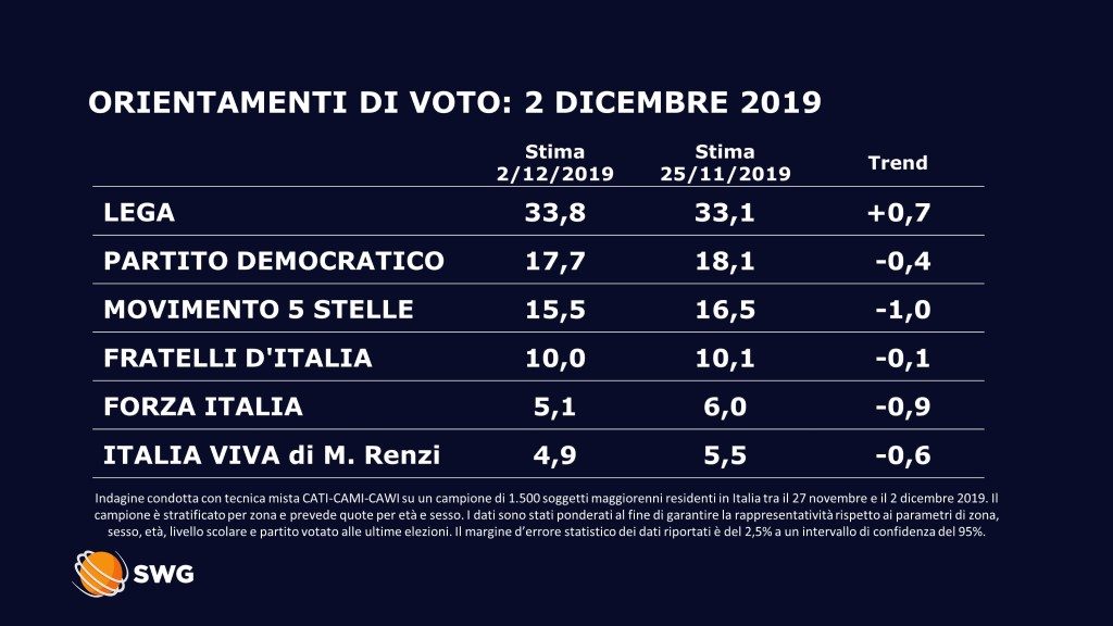 SONDAGGIO SWG PER LA 7: LEGA 33,8. IN CALO PD, M5S E FI. FRATELLI D’ITALIA AL 10%