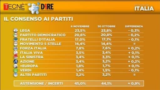 Pare, davvero, che le politiche delle ultime settimane di Matteo Salvini non stiano rimettendo in moto la macchina del consenso verso la Lega che, oramai, è sempre piu’ lontana dai fasti del 34% delle Elezioni Europee del 2019. Ed il Partito Democratico, anche se a piccoli passi, è sempre piu’ vicino alla Lega. Lo indica il sondaggio pubblicato da Tecne’-Dire sulle intenzioni di voto degli Italiani al 7 Novembre 2020.