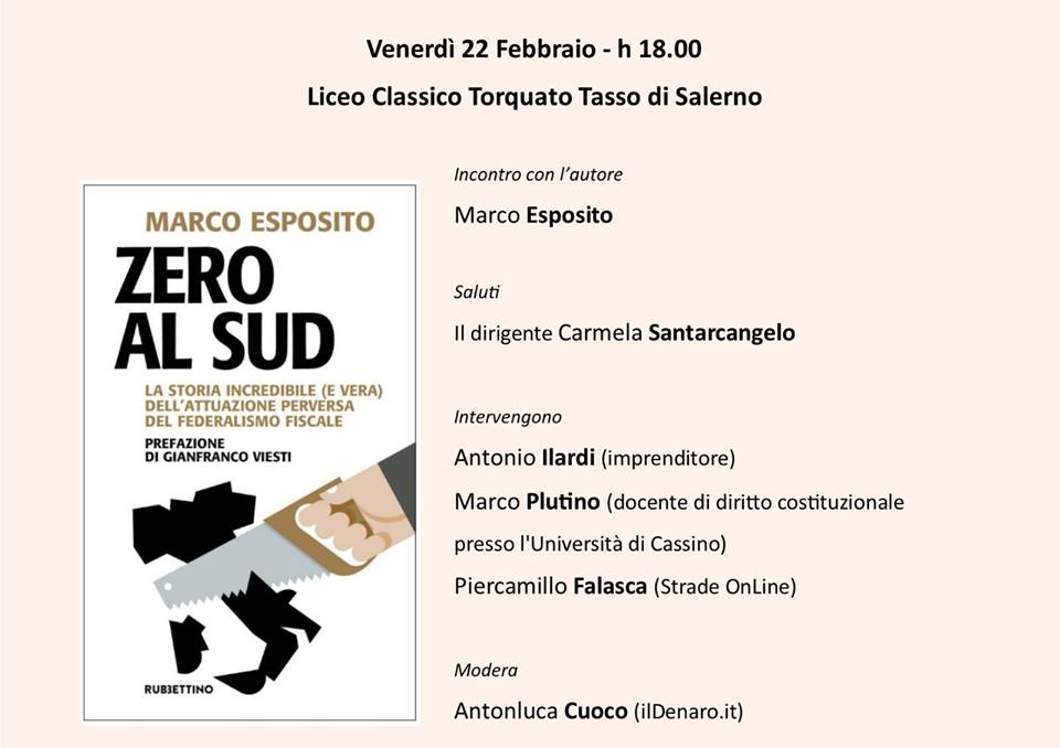 Assieme a Marco Esposito, ci saranno gli interventi della dirigente scolastica del liceo Tasso, Carmela Santarcangelo, dell’imprenditore salernitano, Antonio Ilardi, del professore di diritto costituzionale, Marco Plutino, del direttore editoriale di Strade OnLine, Piercamillo Falasca e del collaboratore del Denaro.it – Antonluca Cuoco, quale moderatore dell’incontro aperto al pubblico ed animato anche dai ragazzi del liceo salernitano.
